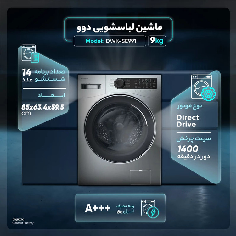 ماشین لباسشویی9کیلویی دوو مدل DWK-SE991S سیلور